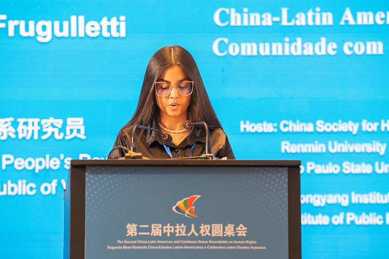 “第二屆中拉人權(quán)圓桌會”25日在巴西圣保羅舉辦。委內(nèi)瑞拉外交部國際關(guān)系研究員卡特琳·亞歷杭德拉·弗魯古列蒂·埃爾南德斯作題為《新科技崛起背景下的人權(quán)》的主旨發(fā)言。主辦方供圖