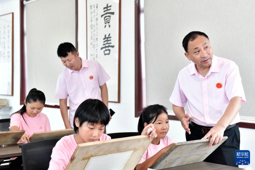 8月5日,在臨沂市臨沭縣孤困兒童心靈家園,徐軍(右一)陪伴孩子們學(xué)畫(huà)畫(huà)。新華社記者 郭緒雷 攝