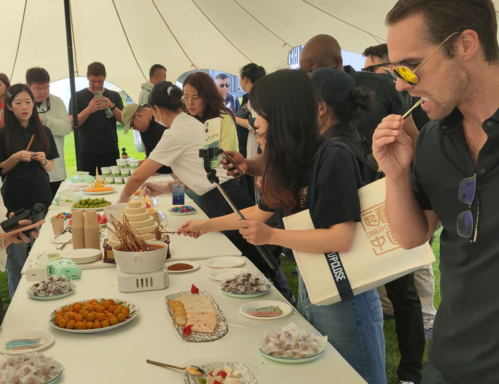 8月4日,“人權(quán)行動(dòng)看中國·2025”采訪團(tuán)成員品嘗首放·錫林郭勒奶酪文化產(chǎn)業(yè)園奶酪制品。(蘭辛珍攝)