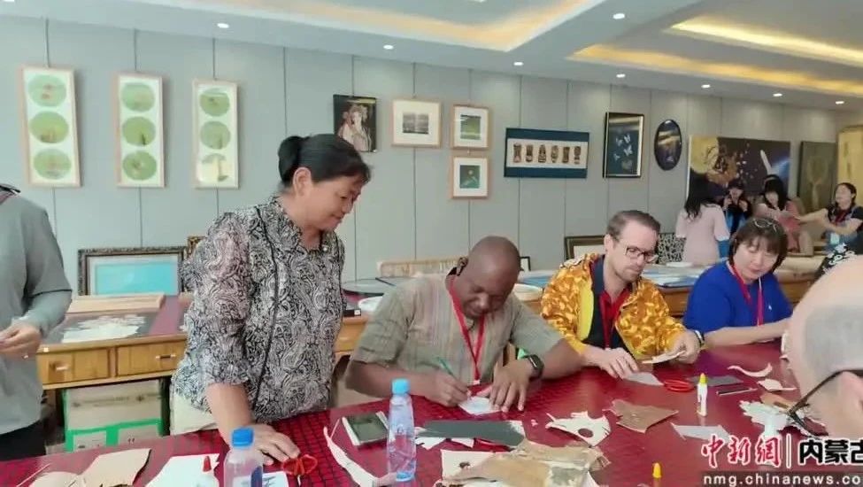 中外嘉賓向制作樹皮畫的老師認真學(xué)習(xí),經(jīng)過描、剪、刻、雕、粘、燙、裝裱等步驟,制作出獨一無二的藝術(shù)品。