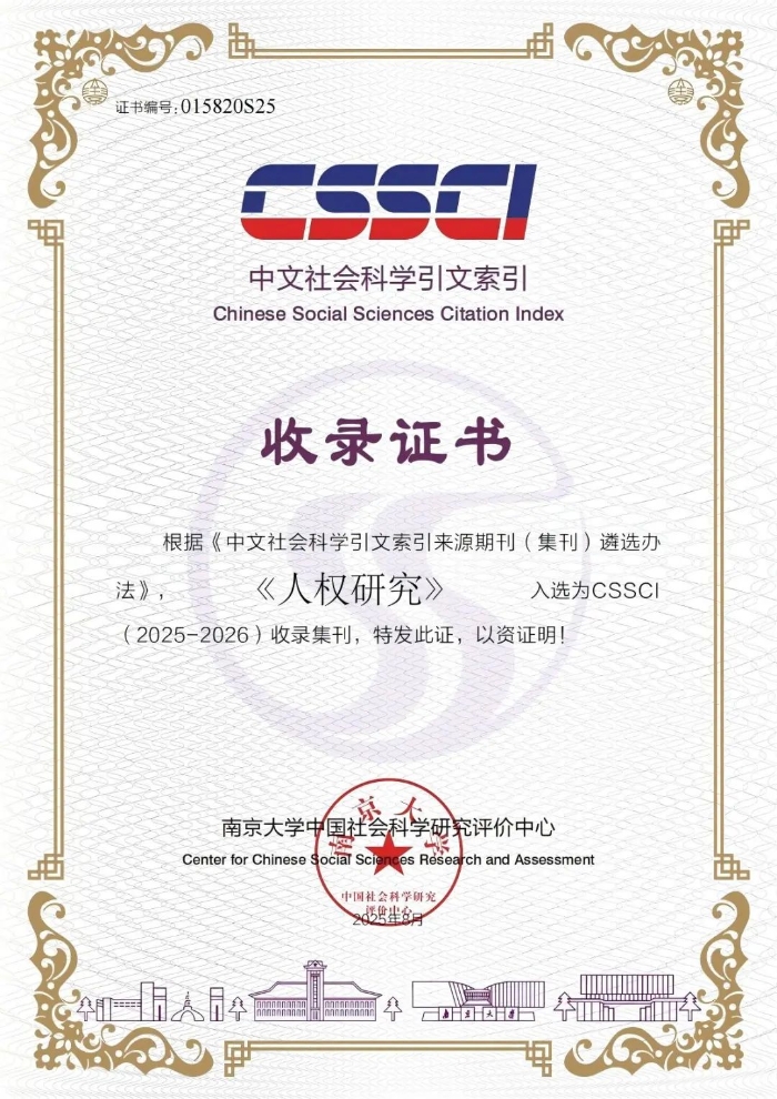 2025年8月,南京大學中國社會科學研究評價中心發(fā)布消息,山東大學人權(quán)研究中心主辦的《人權(quán)研究》入選為CSSCI(2025-2026)收錄集刊。目前,《人權(quán)研究》已連續(xù)多次入選CSSCI收錄集刊。