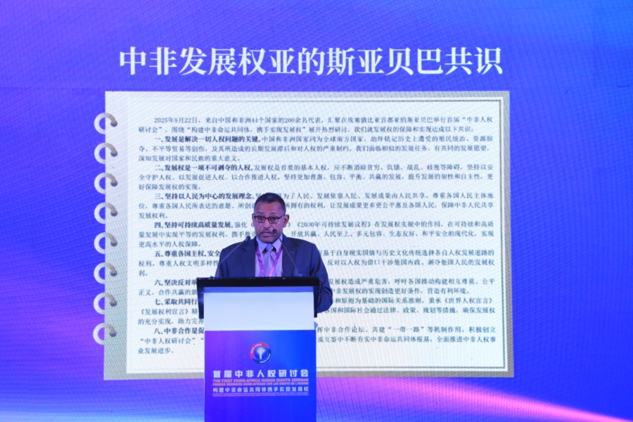 首屆中非人權(quán)研討會(huì)22日在埃塞俄比亞首都亞的斯亞貝巴舉辦。埃塞俄比亞政策研究所副所長阿萊貝爾·德西作為主辦方代表宣讀《中非發(fā)展權(quán)亞的斯亞貝巴共識(shí)》。主辦方供圖