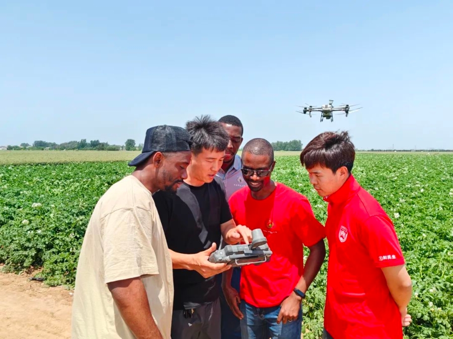 2024年5月13日,馬拉維籍留學(xué)生在河北曲周學(xué)習(xí)無人機飛防技術(shù)。  中新社發(fā) 中國農(nóng)業(yè)大學(xué) 供圖