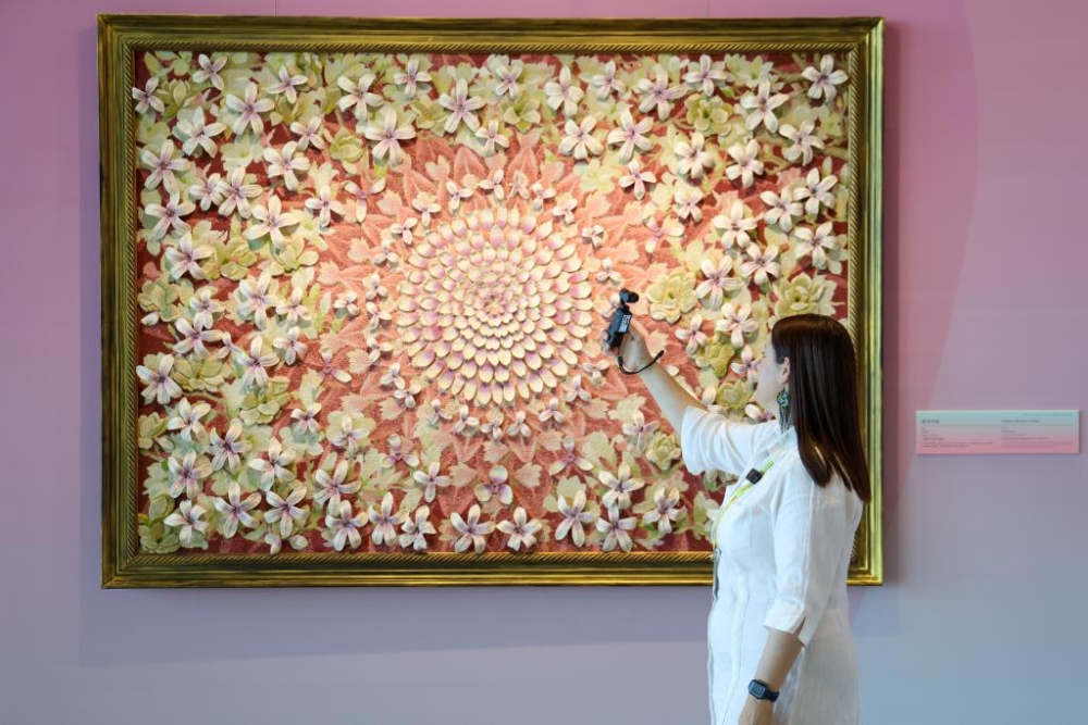 10月13日,一名外國女記者拍攝全球婦女峰會女性主題特展“華韻承芳·非遺共賞”。新華社記者 梁旭 攝