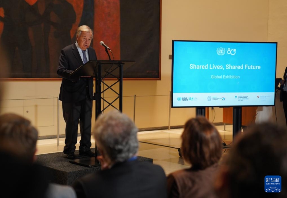 10月20日,在位于紐約的聯(lián)合國總部,聯(lián)合國秘書長古特雷斯在“共棲生命,共享未來”慶祝聯(lián)合國成立80周年全球圖片展啟動儀式上致辭。新華社記者 張鳳國 攝