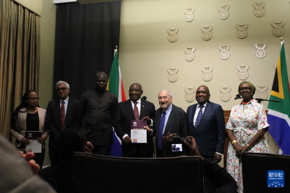 11月4日,在南非立法首都開普敦,二十國集團(tuán)應(yīng)對全球不平等問題特別獨(dú)立專家委員會(huì)主席、諾貝爾經(jīng)濟(jì)學(xué)獎(jiǎng)得主約瑟夫·施蒂格利茨(右三)和專家委員會(huì)成員向南非總統(tǒng)拉馬福薩(右四)提交關(guān)于全球不平等問題的報(bào)告。新華社發(fā)(沙姬拉·泰比攝)