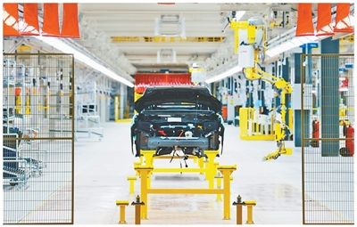 比亞迪巴西乘用車工廠首車下線儀式今年7月1日在巴西巴伊亞州卡馬薩里市舉行。圖為一輛比亞迪新能源汽車正在生產(chǎn)線上裝配。本報記者 宋亦然攝