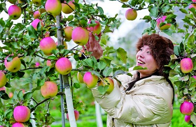 四川茂縣九頂農(nóng)牧蘋果園里,一名來(lái)自成都的游客體驗(yàn)蘋果采摘。新華社發(fā)