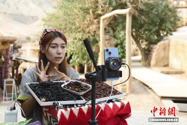 2025年9月9日,新疆鄯善縣吐峪溝景區(qū)商戶在直播賣(mài)貨。中新社記者 王紫儒 攝