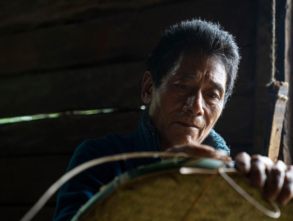 巴登村村民新向東在家編織竹筐(2022年4月15日攝)。新華社記者 晉美多吉 攝