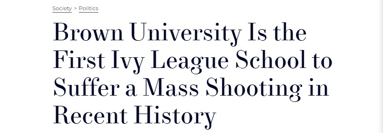 2025年,美國校園的安寧屢遭打破。據(jù)美國《城鎮(zhèn)與鄉(xiāng)村》網(wǎng)站(Town and Country)報道,本月13日發(fā)生的布朗大學槍擊案致2死9傷,成為常春藤盟校近期首所發(fā)生大規(guī)模槍擊案的學校。事件導致校園提前關閉,師生陷入恐慌。校長克里斯蒂娜·H·帕克森(Christina H.Paxson)稱,兩名遇難者“都是才華橫溢的年輕人,本應擁有光明的未來,卻過早消逝”。