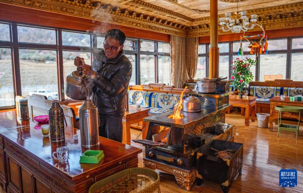 2月5日,玉麥鄉(xiāng)村民旺慶在自家經(jīng)營(yíng)的民宿里灌開水。新華社記者 丁增尼達(dá) 攝